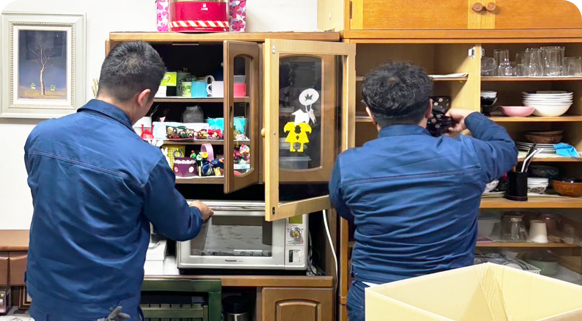 遺品の搬出は、遺品整理 架け橋の熟練スタッフがすべて担当します。重たい家電や家具などを無理に運ぼうとすると事故が起こる可能性がありますが、プロが安全に搬出するので安心です。特に高齢者や女性のお客様に安心してご利用いただいております。